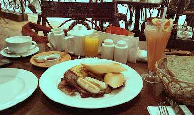 This morning we had an Omlette with chicken sausage, french baguette , tea and grapefruit juice and brown bread.